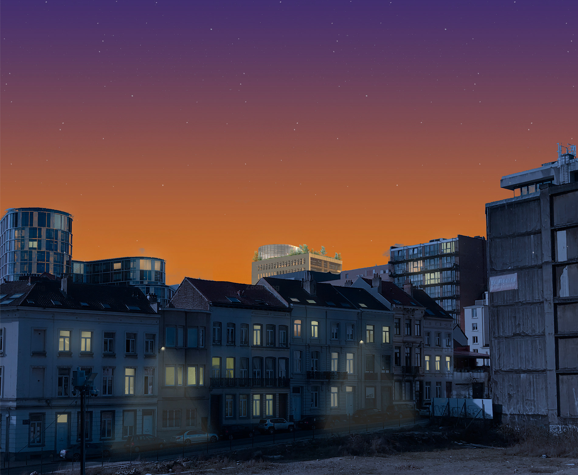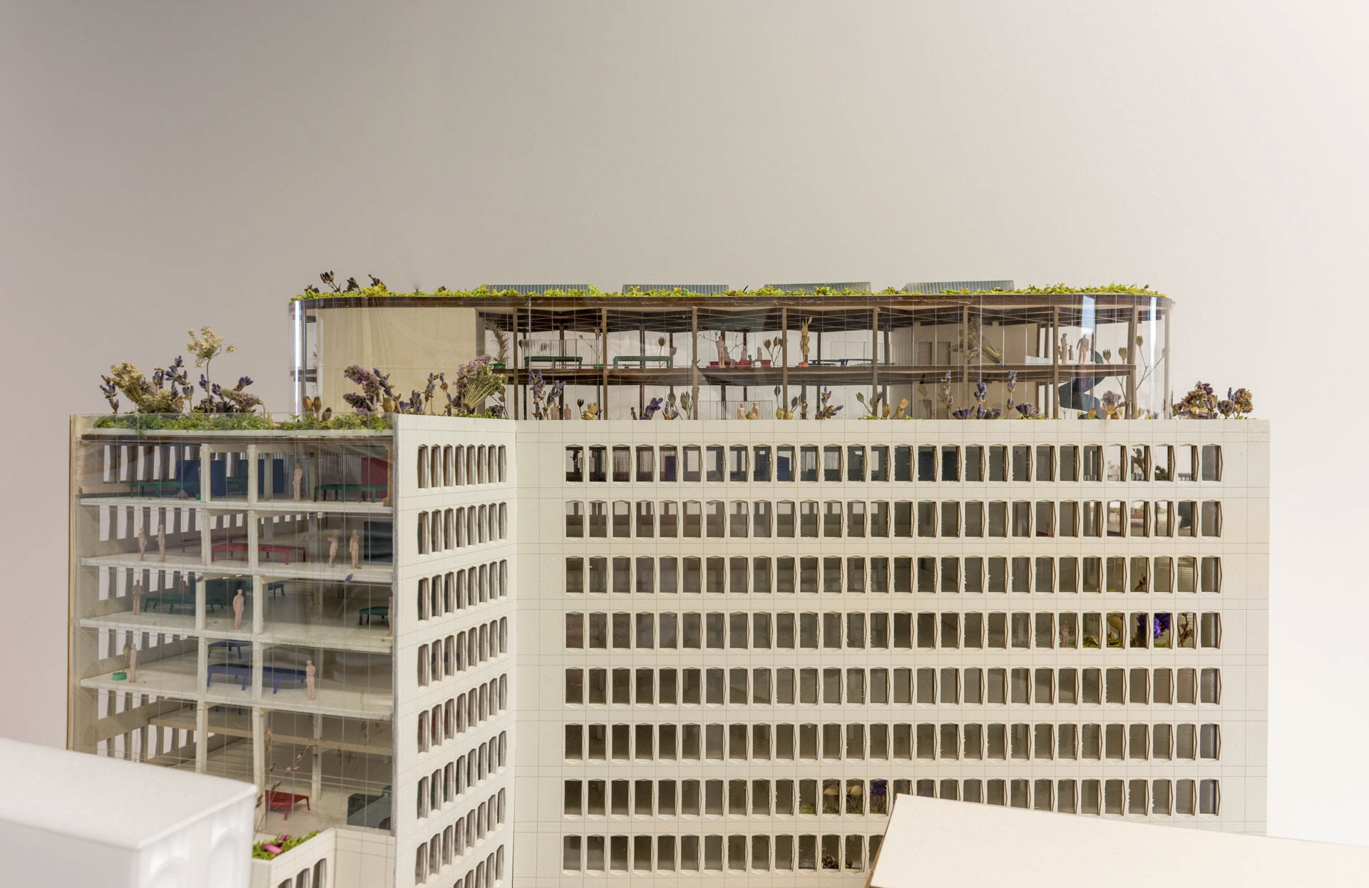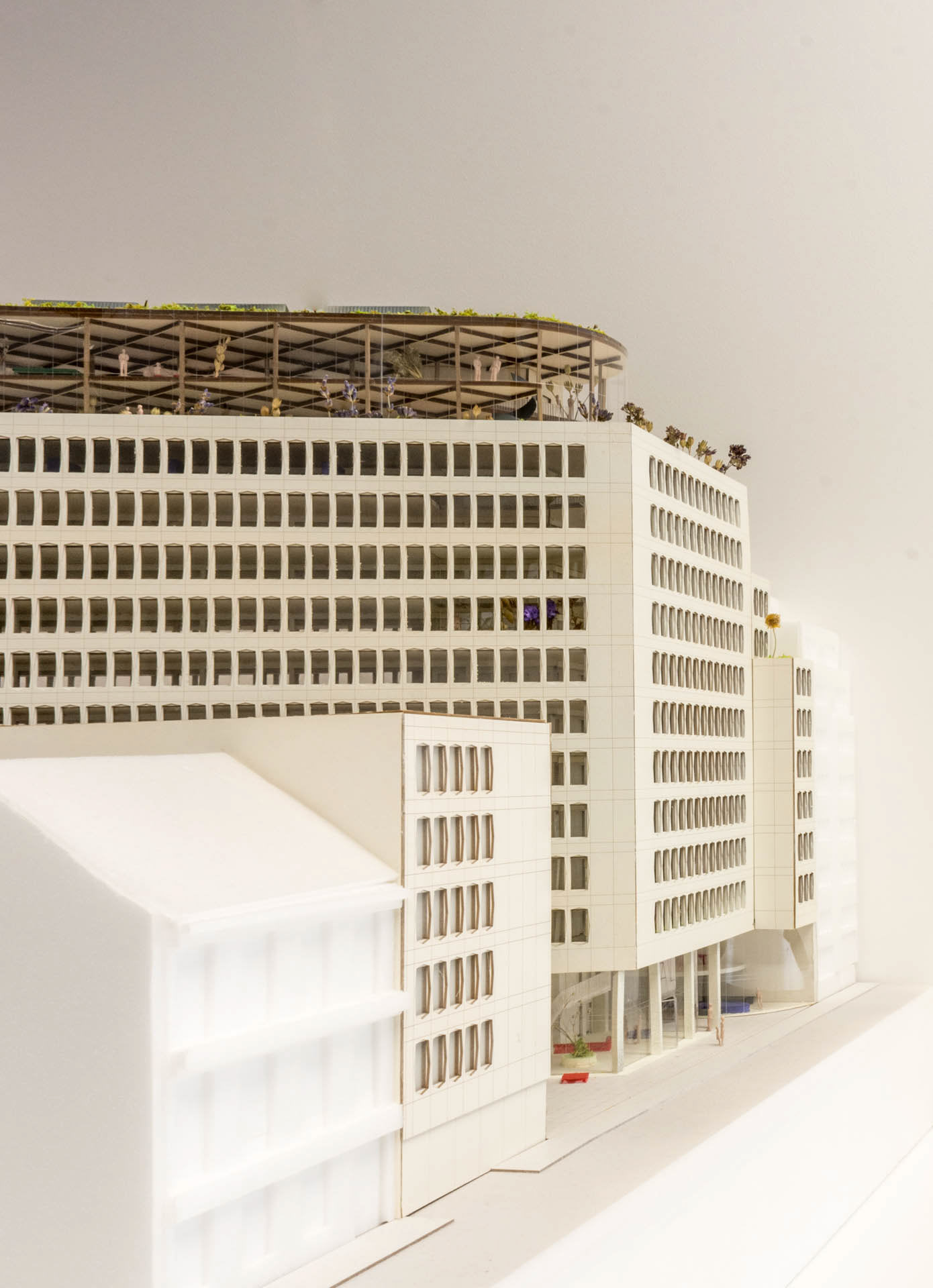 The A\Tlier competition is a renovation project of an iconic seventies office building located in the European quarter in Brussels. It results from a collaborative research and design process on a historical, urban, architectural, and technical level. The proposal reinforces the iconic value of the building and the implications of the 21st-century contemporary office. These were achieved through a number of specific interventions, which considered the silhouette, ground floor activation, plan, and sections of the building.