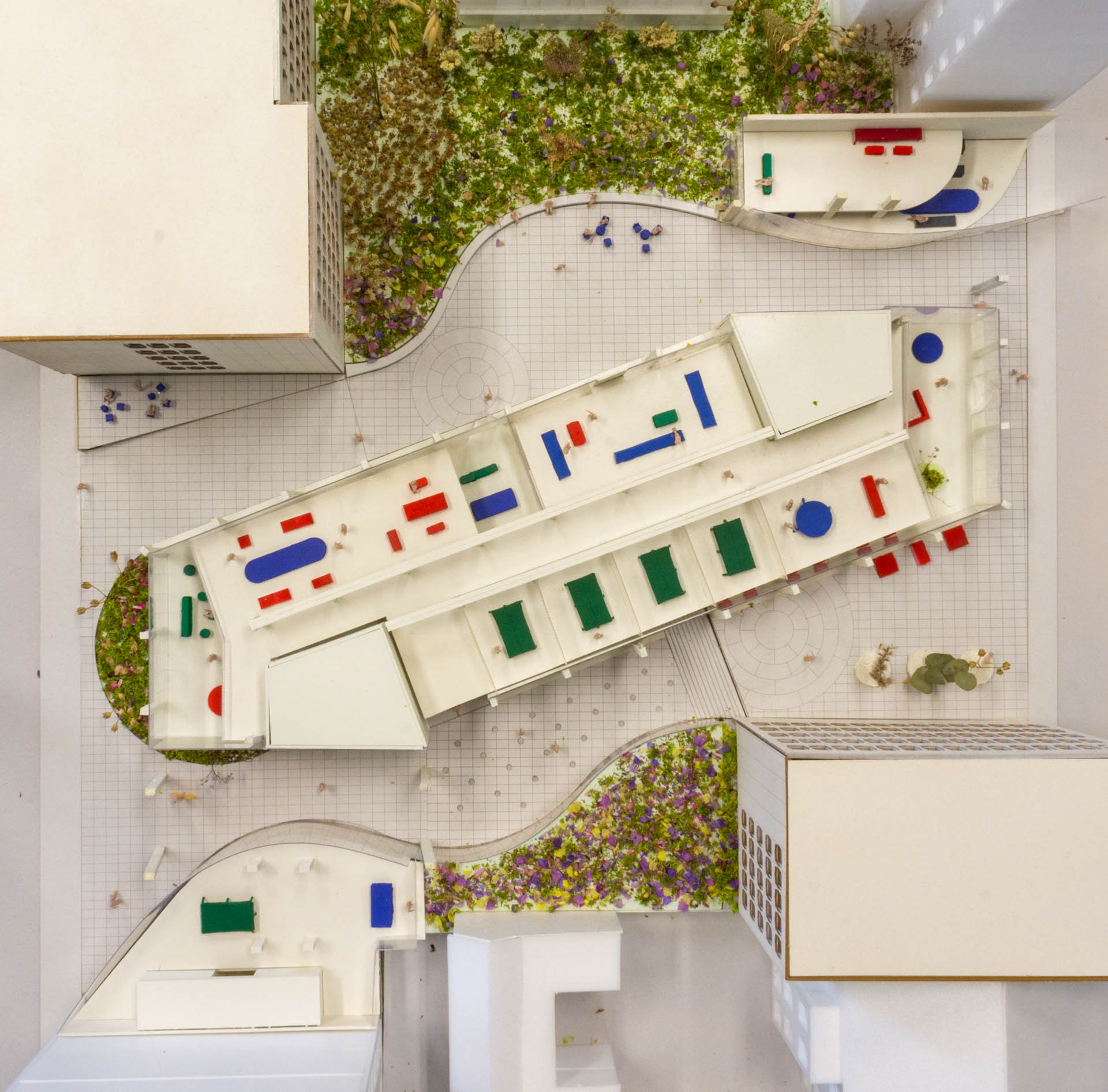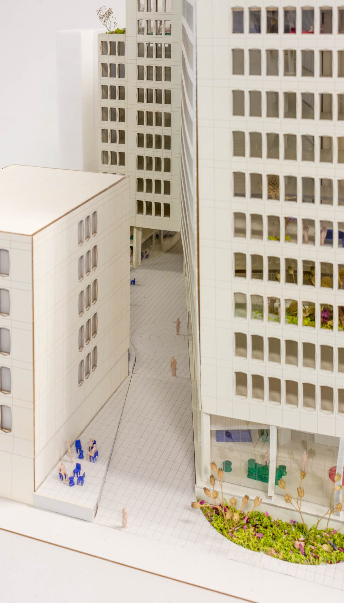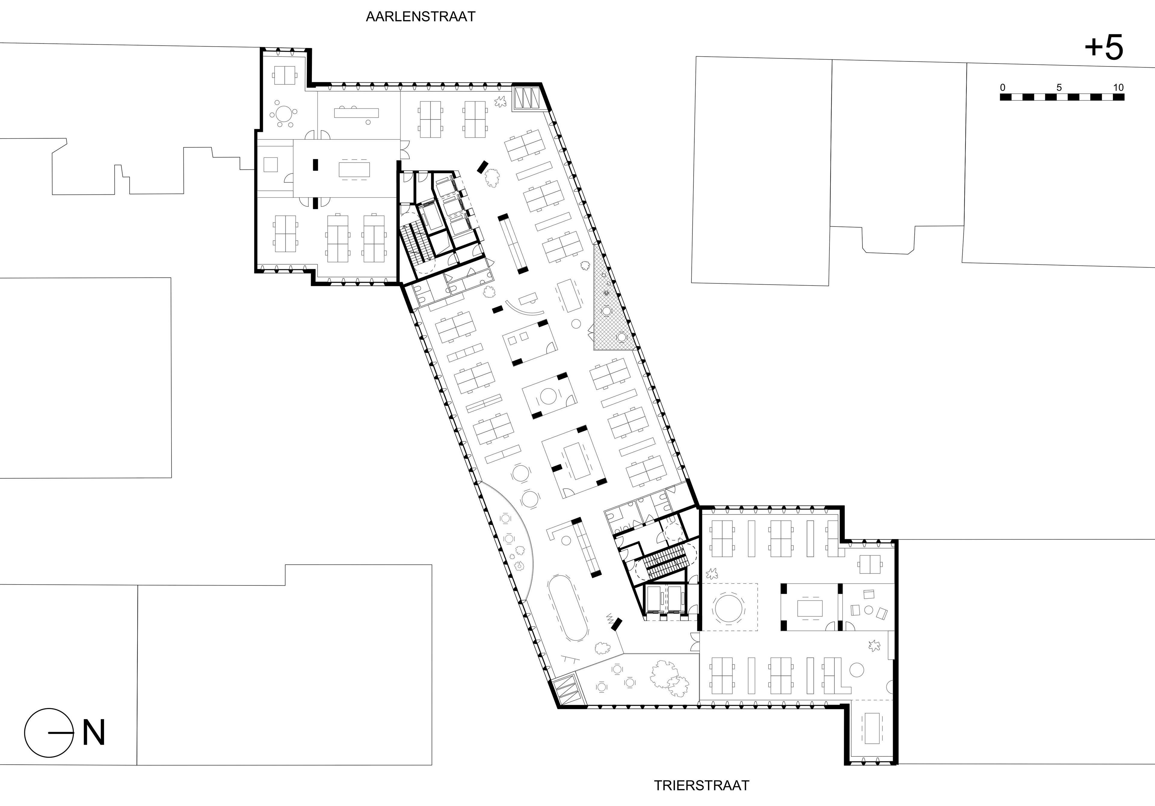 The existing building is part of a remarkable urban ensemble, which breaks the morphology of the block connecting Arlenstraat and Trierstraat. Through a analysis of historic materials, the project’s fascinating genesis was unveiled. A\Tlier intends to breathe new life into the project’s original intentions and reactivate its urban potential. This was achieved by implementing a shifting and sloped promenade that connects the adjacent streets and creates an inviting and continuous public space within the site that is activated by public and commercial programs. As a result, the promenade creates a physical connection between the adjacent streets and underground programs while also establishing a visual relationship between the main office volume and the complex public realm by emphasising the previously hidden podium.