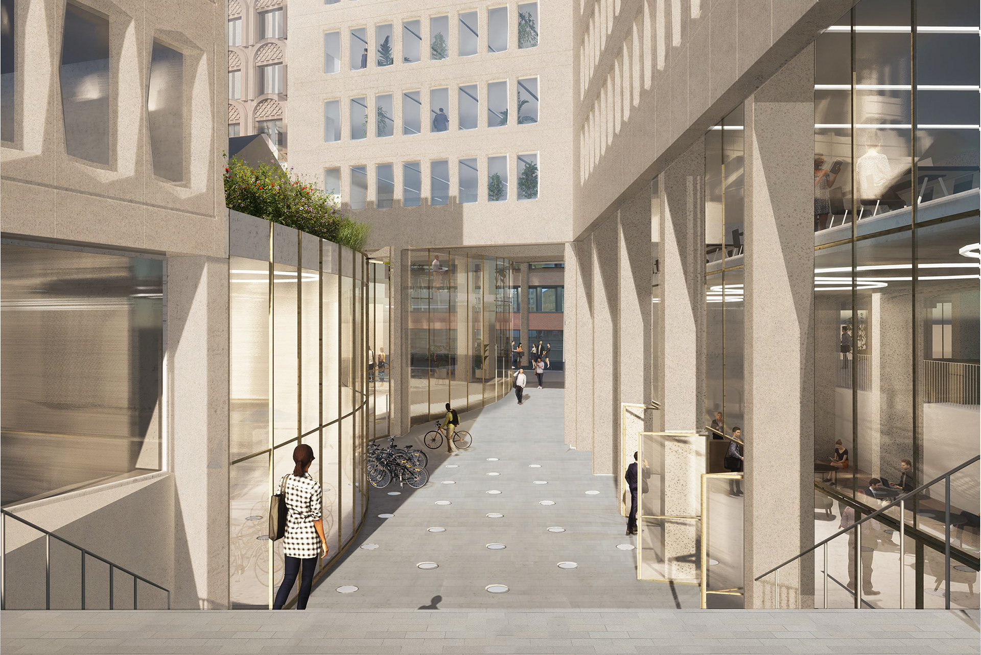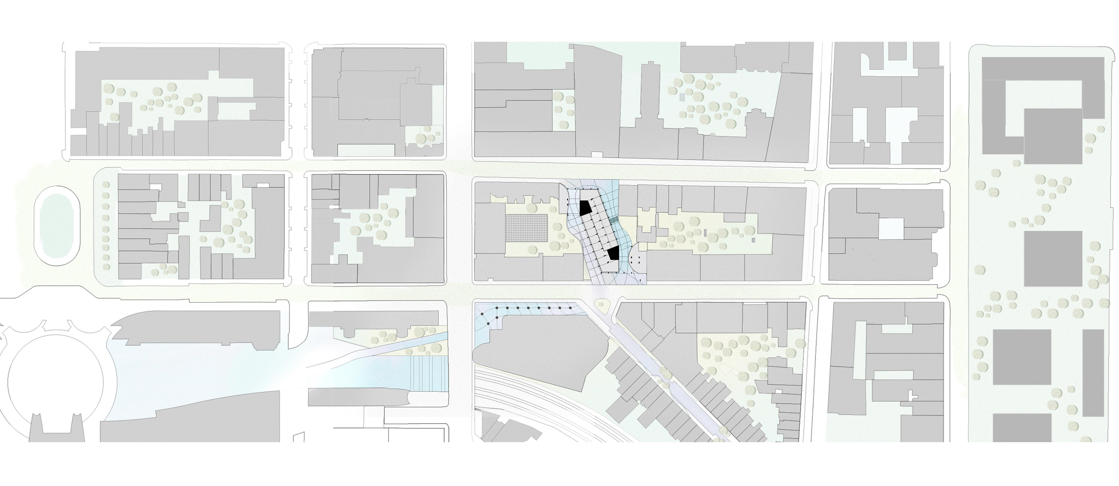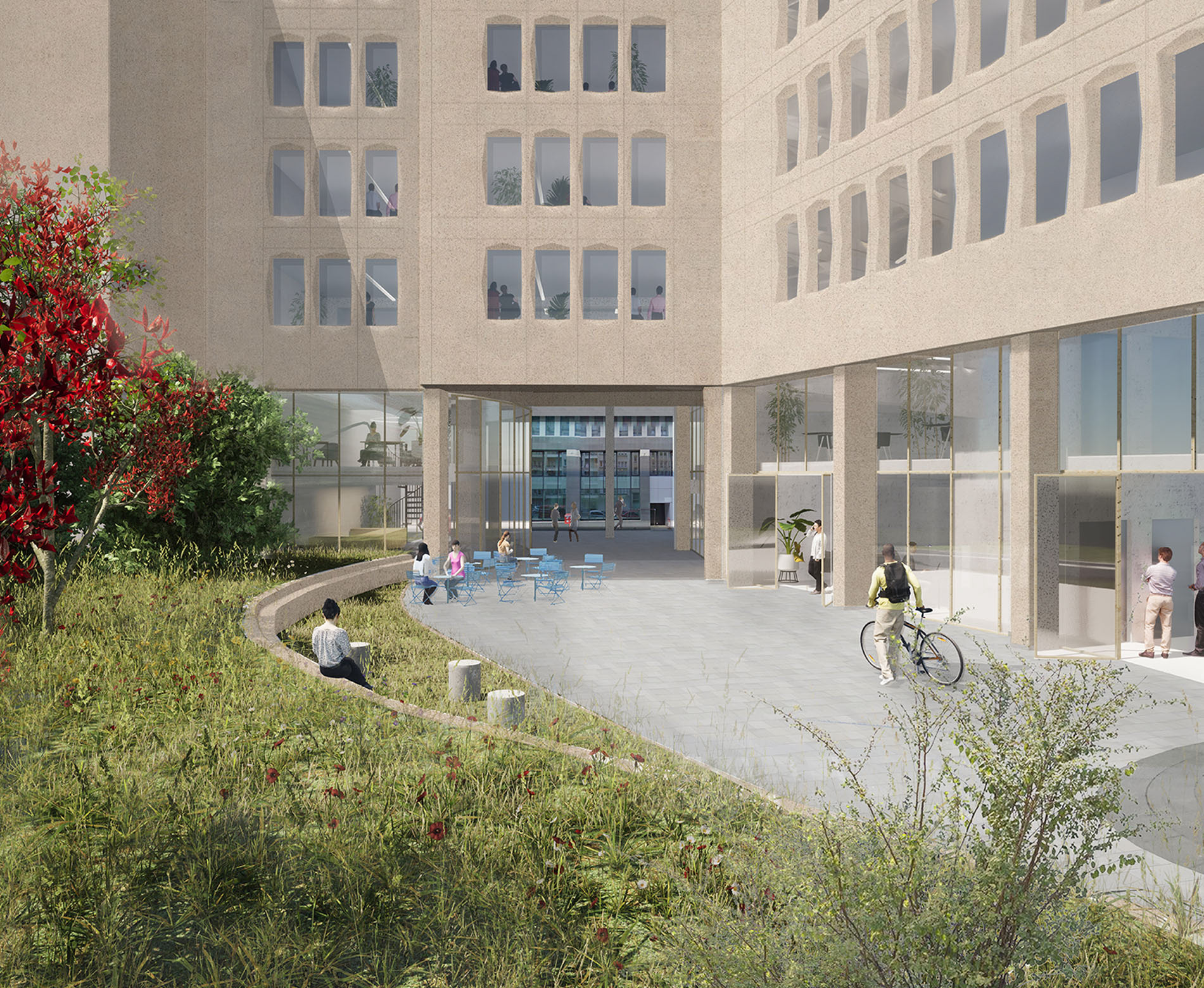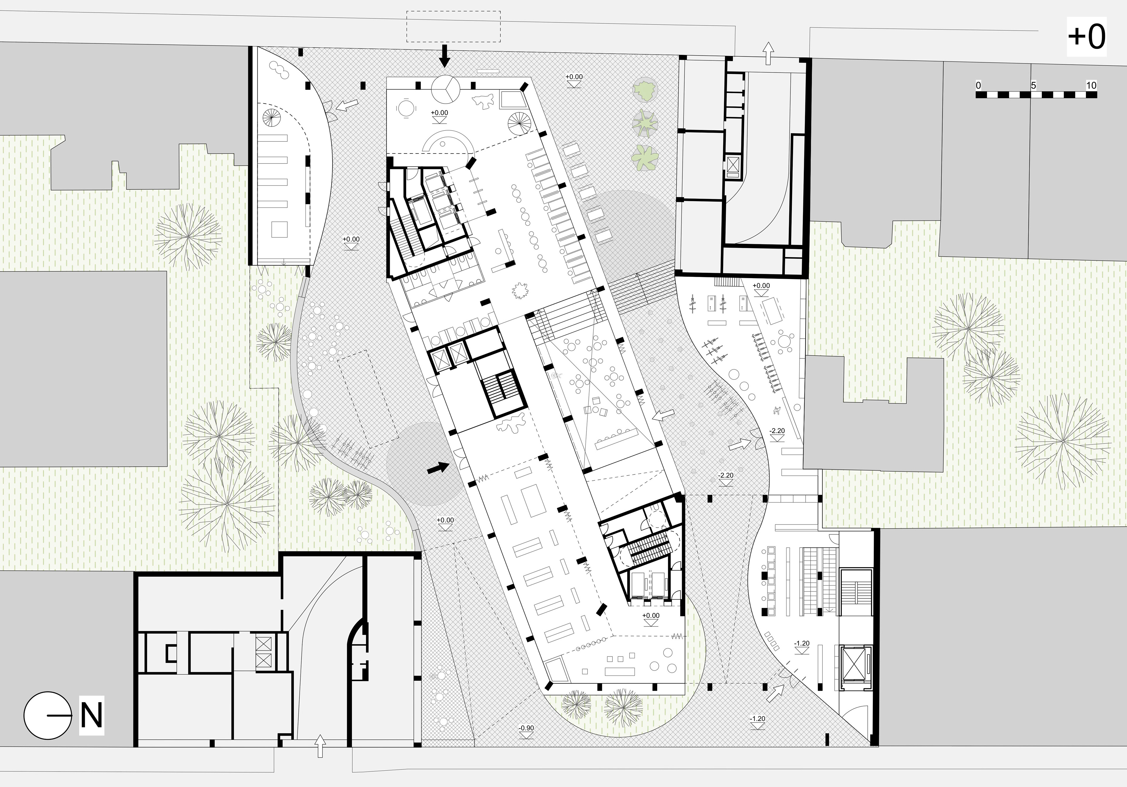 The existing building is part of a remarkable urban ensemble, which breaks the morphology of the block connecting Arlenstraat and Trierstraat. Through a analysis of historic materials, the project’s fascinating genesis was unveiled. A\Tlier intends to breathe new life into the project’s original intentions and reactivate its urban potential. This was achieved by implementing a shifting and sloped promenade that connects the adjacent streets and creates an inviting and continuous public space within the site that is activated by public and commercial programs. As a result, the promenade creates a physical connection between the adjacent streets and underground programs while also establishing a visual relationship between the main office volume and the complex public realm by emphasising the previously hidden podium.