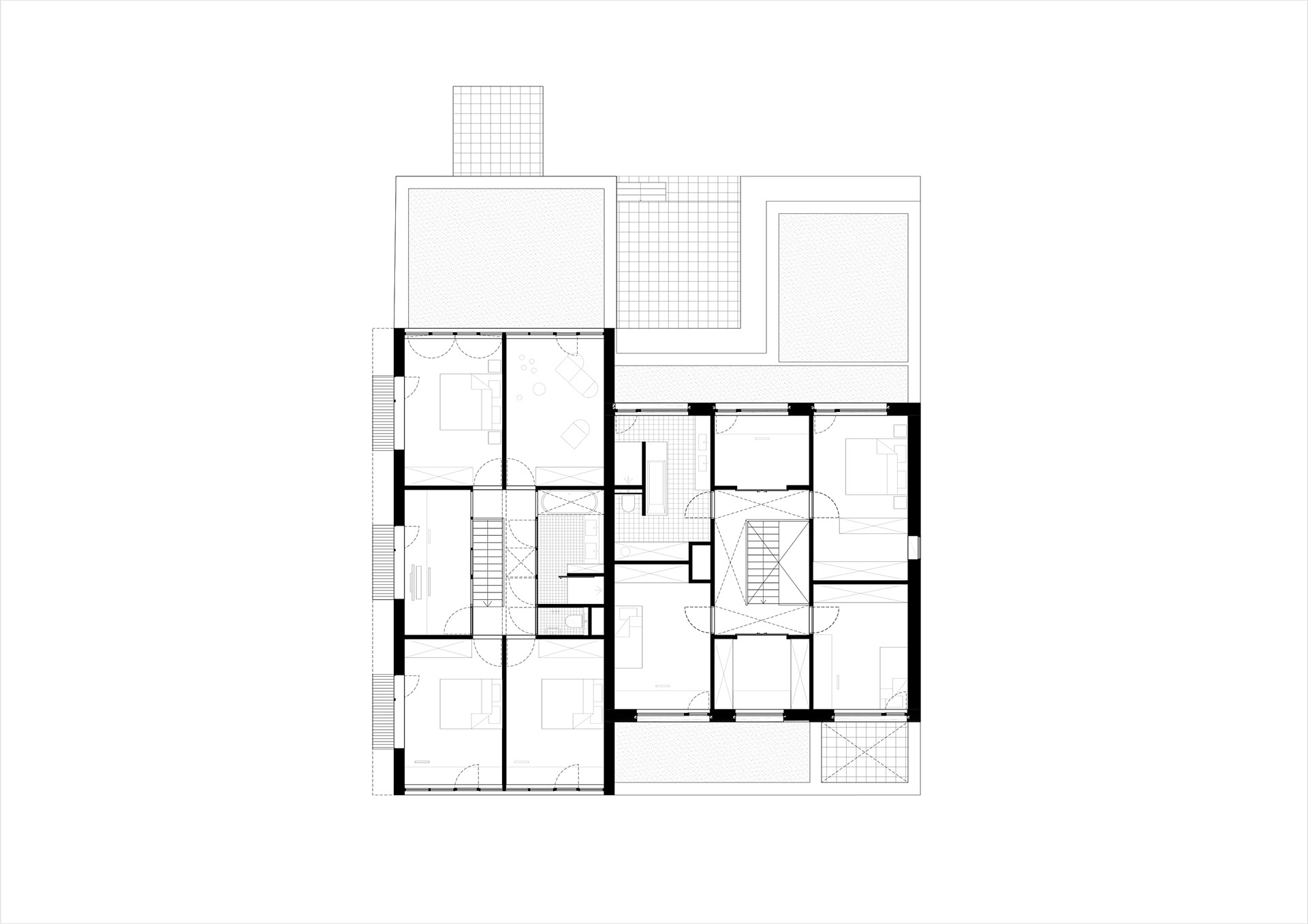 The floor plan follows a clear 80 x 80 cm grid, with modules of 320 x 480 cm defining the base structure. Within this rational framework, the grid is handled flexibly to address the functional needs of the residents.