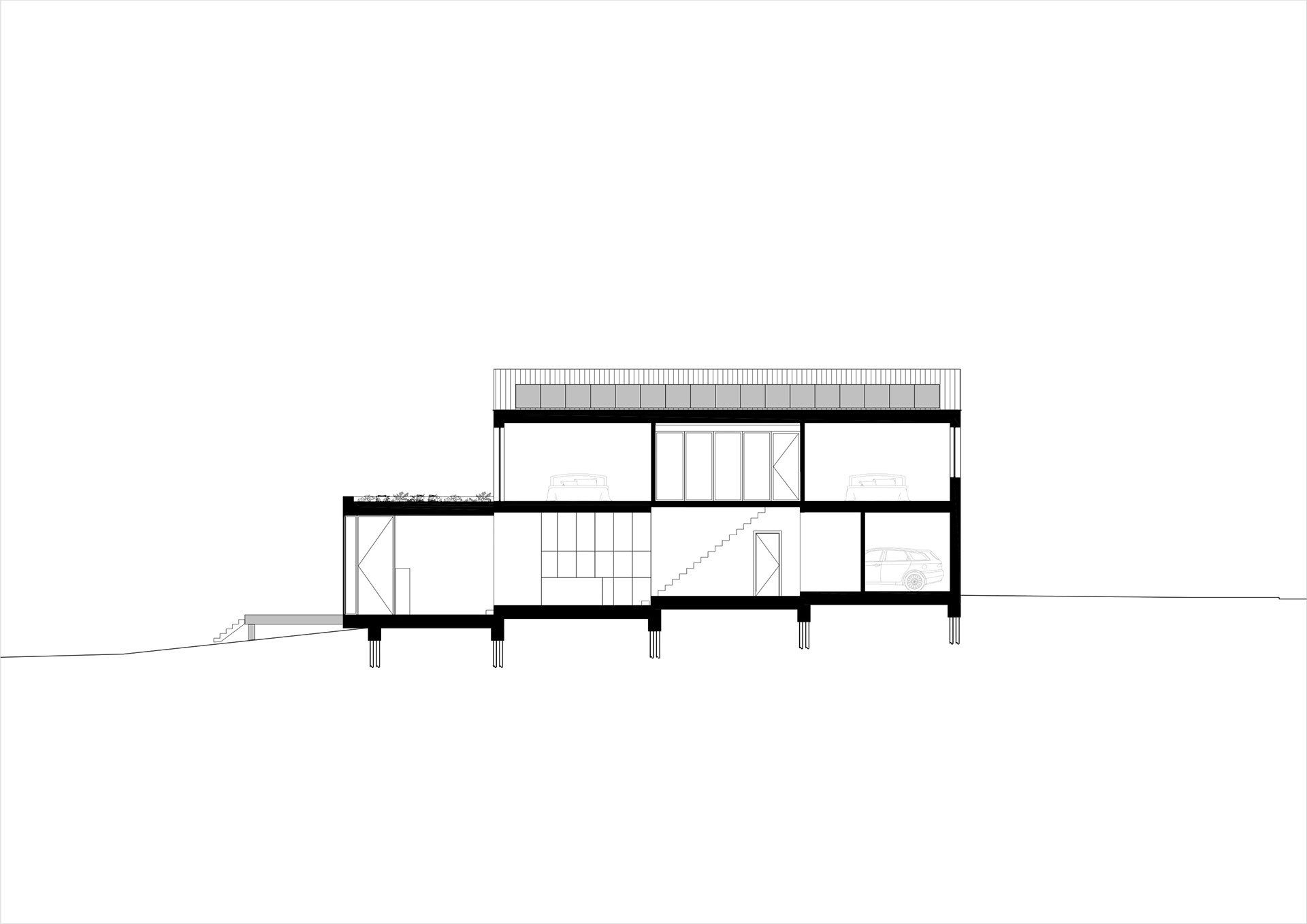 The plots have significant level differences: the gardens sit noticeably lower than street level. These shifts are absorbed by a stepped building section. Combined with generous garden-facing openings, this reinforces the direct connection between interior and landscape. Both houses aim to deliver a high-quality living environment in close dialogue with their rural surroundings.
