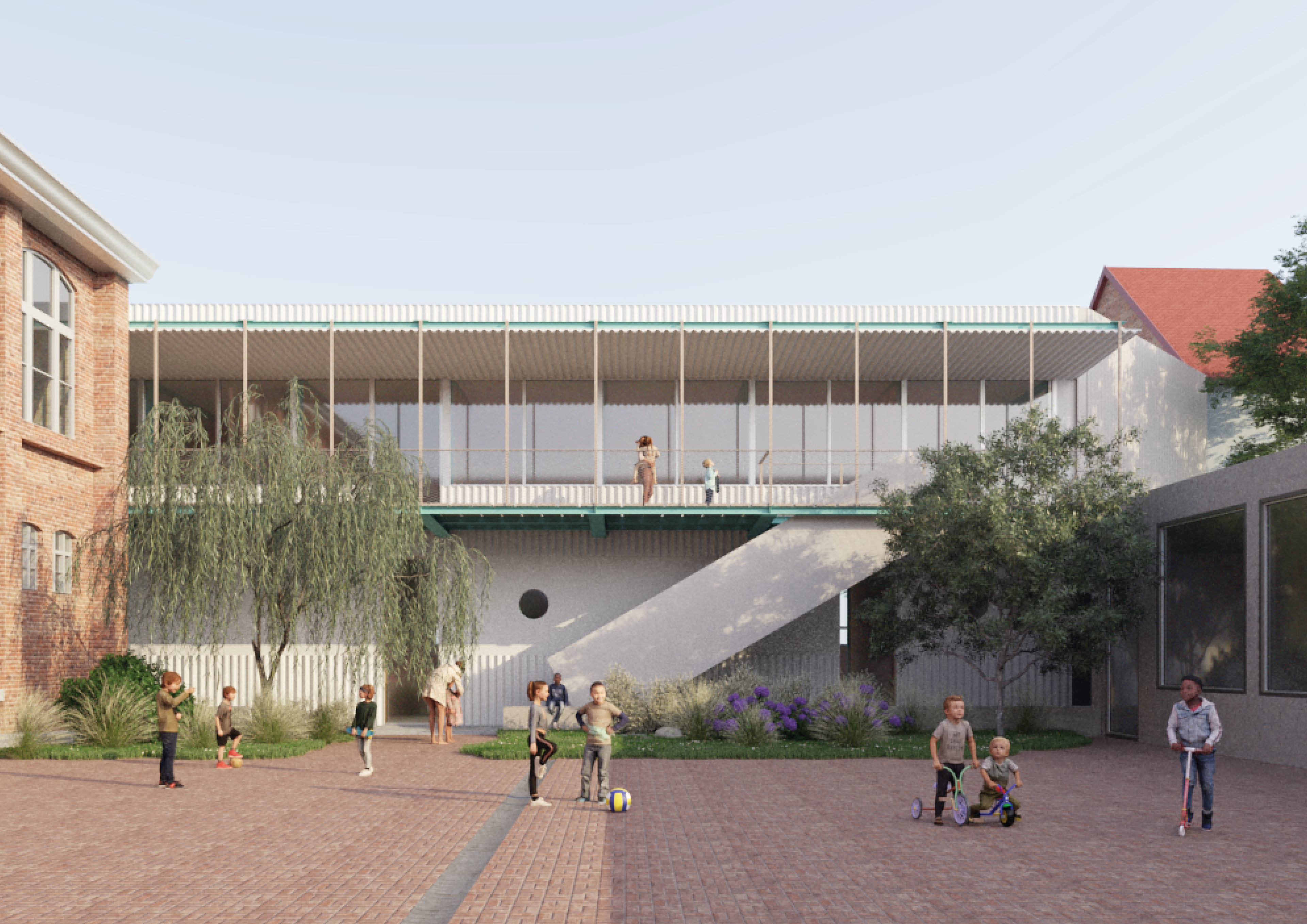 The starting point for this design is to seize the construction of the daycare center as a unique opportunity to also safeguard the school and its operations. We design an easily buildable shell with a certain excess that can serve as an expansion vessel.