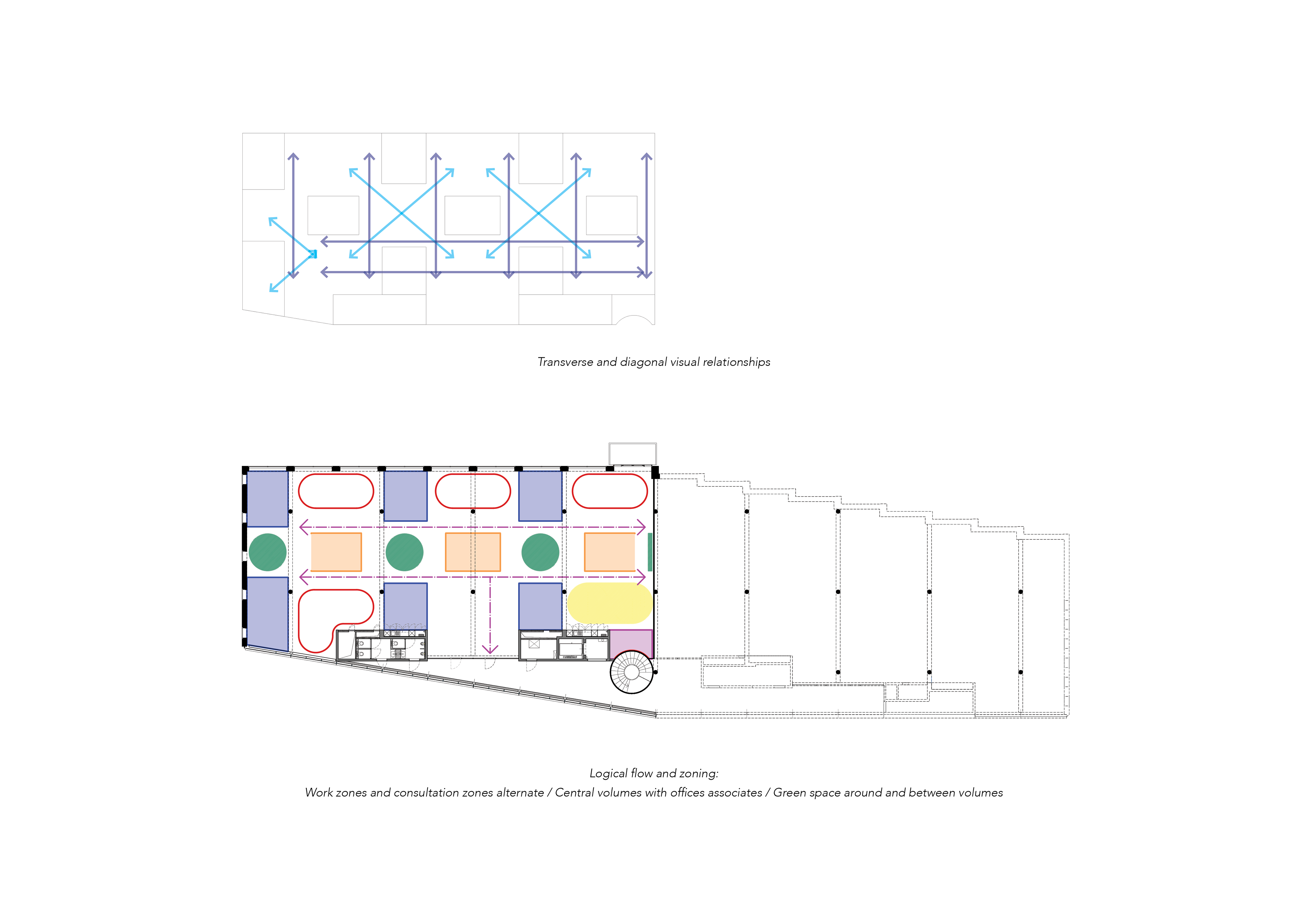 Within the project OFFICE PARK Lokeren NWLND was appointed the interior design for an accountancy and legal firm. This firm obtained two units, making up half of the second floor of the office building. NWLND challenged the building’s set-up by developing diagonal relations defined by the implantation of enclosed office and meeting spaces within an open space plan.